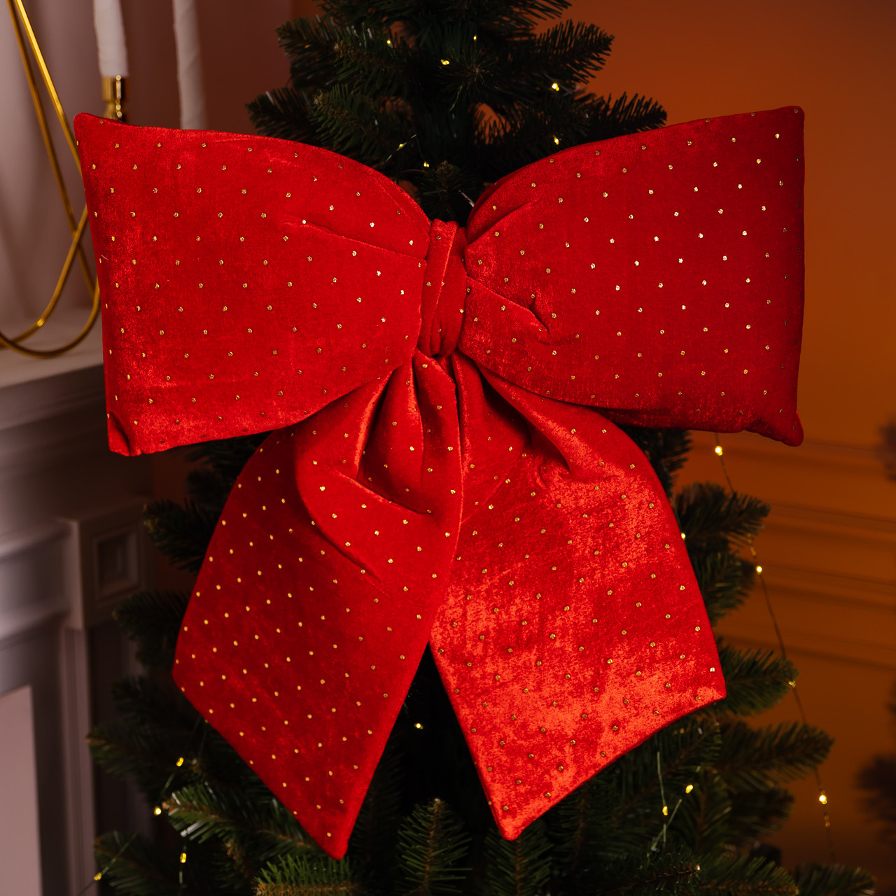 Елегантний червоний оксамитовий бант зі стразами розміром 55х70 см стане виразним акцентом будь-якого святкового оформлення. Яскравий червоний відтінок оксамиту та м'яке свічення страз створюють атмосферу розкоші та урочистості. Бант виконаний із щільного оксамиту з бархатистою текстурою, що надає йому обсягу та форми. Металеве кільце на звороті забезпечує легке та надійне кріплення – на дверях, стінах, вітринах, ялинці або фотозоні. Основні характеристики великого оксамитового банта на ялинку, двері, для декору: Розмір: 55×70 см; Матеріал: оксамит зі стразами; Тип кріплення: металеве кільце; Призначення: вітрин, декор для свят, інтер'єру. Цей оксамитовий бант зі стразами – не просто прикраса, а ефектний акцент, який надасть будь-якому простору святкового та елегантного вигляду. Він підкреслить атмосферу урочистостей і стане стильною деталлю, здатною перетворити інтер'єр одним рухом.